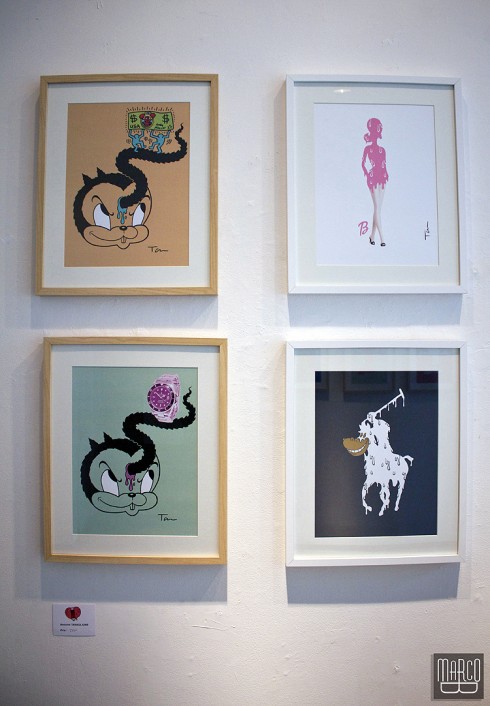 50’s pop culture, spoofing sports & famous animation studios, tongue in cheek humor, Andy Warhol making art using illustrator, those were some of the terms we used to describe Antoine TavaglioneDirty Does It exhibit last month. Sounds to good to be true, right? We have some of pictures from the exhibit and it definitley did live up to its expectations. We literally could’ve bought all of them to put in our homes and office!! Below are some our personal favorites.