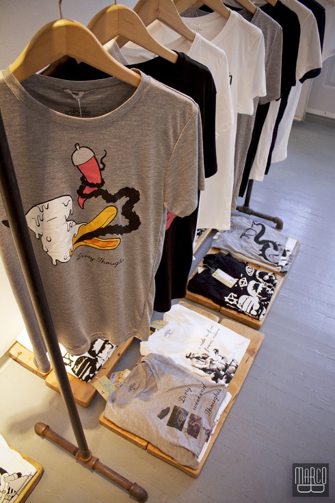 Turns out Antoine not only had art in mind but as well as fashion. During the Dirty Does It exhibit Antoine also launched/exhibited his Dirty Thoughts collection (dude! do you sleep?!?!!) which we are really proud to point out that it is 100% designed & made in Montreal!! You can find the t-shirts currently in Montreal at Influence U.