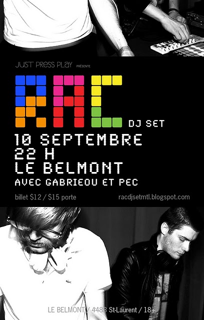 Electro drum samples, analog synthesizers, melodic hooks are all trademark sounds of Remixers/Producers/DJ’s: Andre Allen Anjos, Andrew Maury and Karl Kling or better know as the Remix Artist Collective aka Rac. Hailing from Portland (Andre & Karl) & New York (Andrew) the trio definitely have definitely carved a niche as hard workers when it comes down to remixing. Unlike some remixes where you hear just a sample of a loop, beat, chorus or verse and dragged out into a 7 minute club mix a RAC remix is like hearing a brand new song. From Phoenix, Washed Out, Delorean, Phantogram, U2, Kele, Holy Ghost!, Kings of Leon & Chromeo to name a few are some of the bands who have had their work reinterpreted/reinvented. With such a disiplined approach to production and remixing we can only imagine what they have in store when they DJ. Check them out their work below then in person this Saturday at Le Belmont.